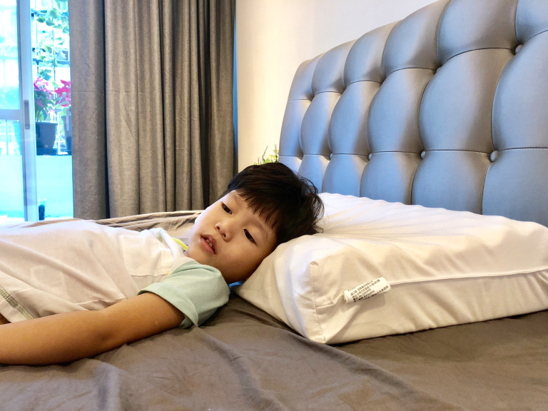 後來也給他換過日本買的兒童枕頭,厚一點,但他還是不喜歡一樣沒睡在上面。
