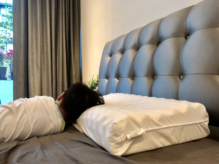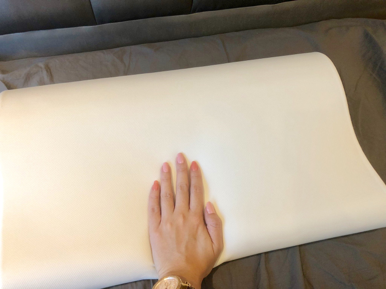 我自己也試躺一下覺得真的滿舒適的,這邊可以看一下平常躺的枕頭,比較高,躺起來比較不服貼