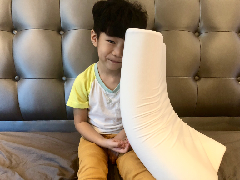 撇開記憶枕本身就躺起來舒服,有做高低枕的有差,睿睿近看頸部與頭部都服貼在枕頭上,難怪晚上睡得好呀!