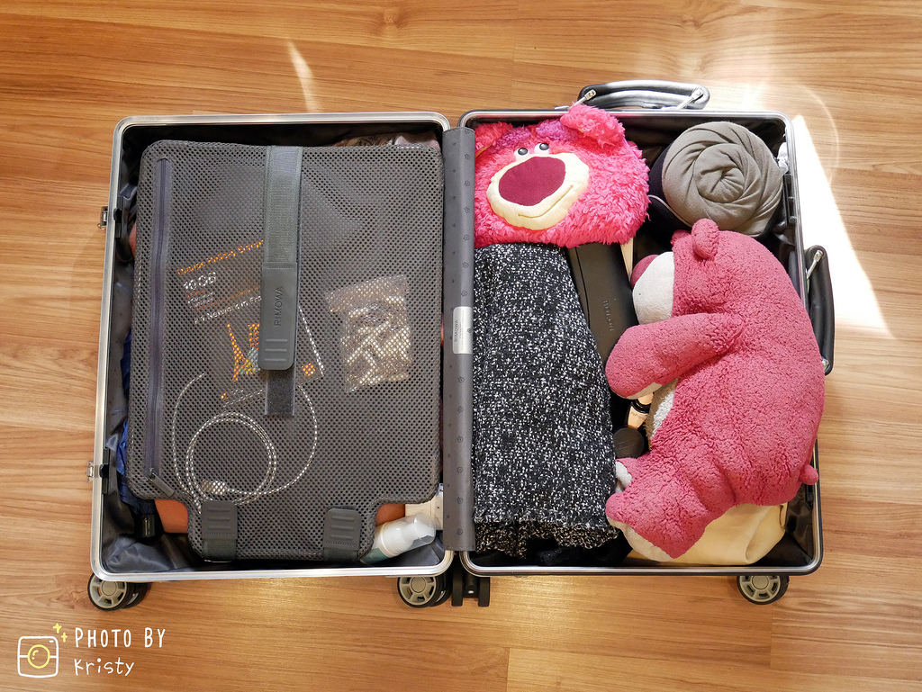 除了捲起來收納之外,如果今天登機箱裡面剛好有易碎物品,它也可以攤開去做側邊防護的作用。