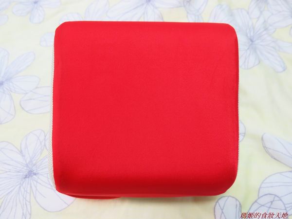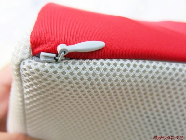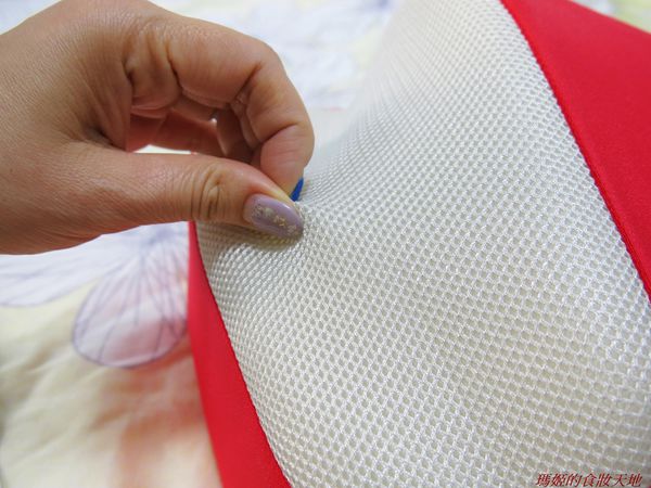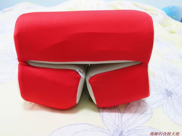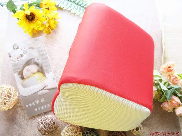 午睡枕紅色部份是使萊卡布,材質柔軟有彈性,躺在上面觸感很舒服不擔心會刮傷臉部肌膚