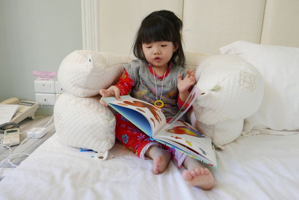 大寶女兒喜歡坐在 GreySa格蕾莎「哺乳護嬰枕」看故事書。