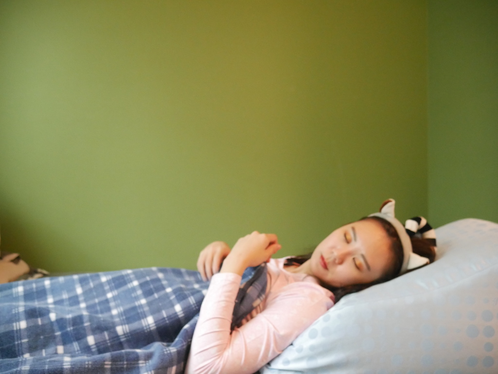 因為我的睡衣也是粉紅色 避免跟抬腿枕融為一體我選了淺藍圓點這個顏色
