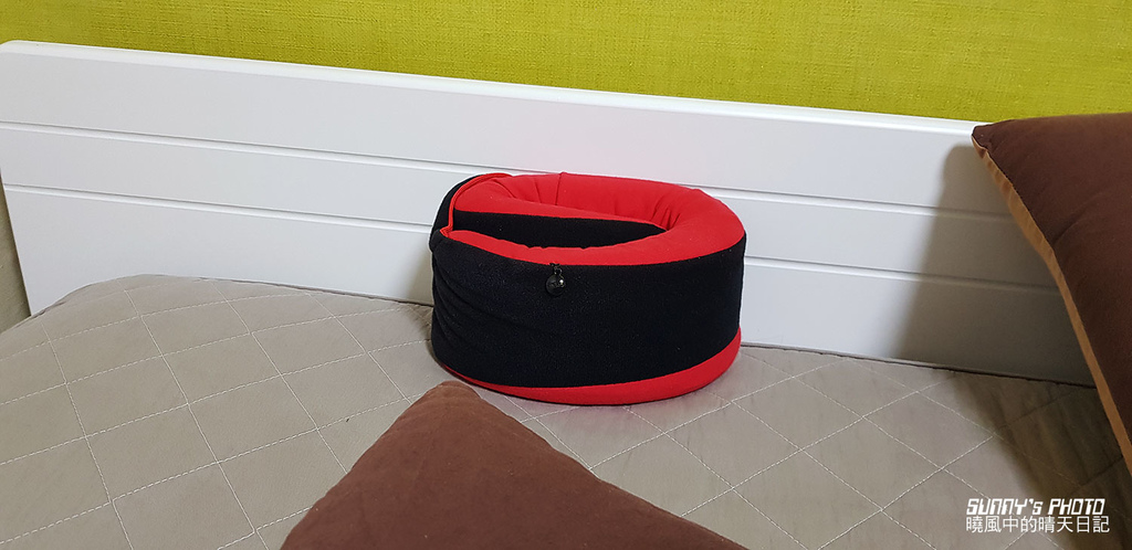 這回在韓國我住的是之前就住過的民宿,但民宿是便宜、但相對的也就是不太能要求硬體設備,小叮噹睡了二天後就一直嫌它的枕頭太過軟也過低,讓他沒法好好睡;這時晴兒靈機一動,我們有個頸枕呀!!