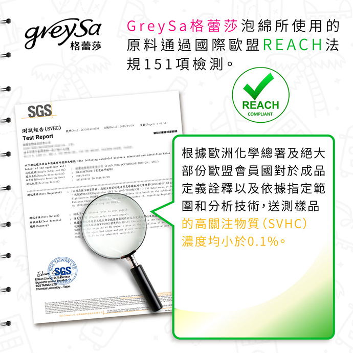 3) 採用德國大廠原料、通過多項國際檢測及認證:使用有品質的原料,杜絕任何有害物質,GreySa格蕾莎頸枕也通過多項國際檢測及認證,如REACH法規151項檢測、CertiPUR認證、RoHS認證。