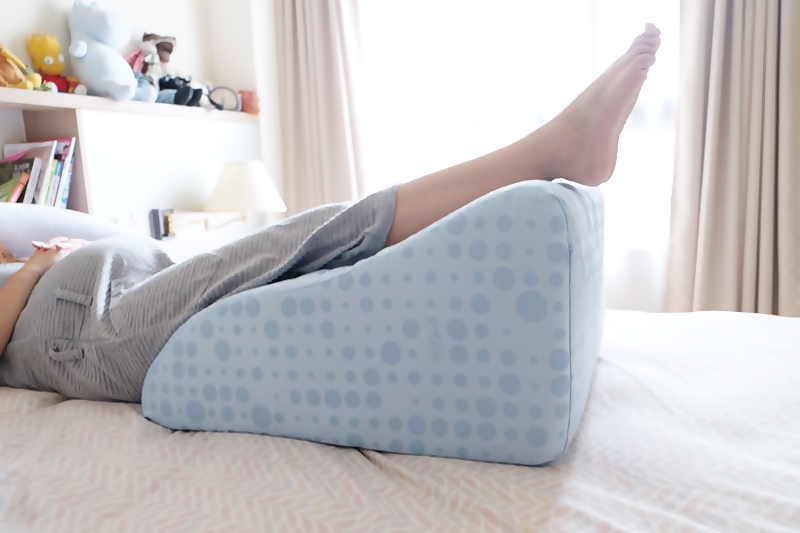 懷孕前我一直很愛翹腳,這個動作其實很不好,容易造成靜脈曲張,因此有時想到我就會抬腿,而且一定要抬到90度,然而抬那麼高反而是錯的,膝蓋關節會因此受傷!懷孕後更不能這樣抬腿,有小腿水腫、靜脈曲張困擾的孕媽咪特別需要「抬腿枕」這個輔助工具。