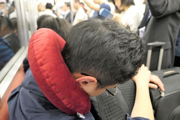 重點是他脖子上掛著頸枕,但一般的頸枕下巴那邊空空的,睡覺的時候還會隨著電車甩來甩去,真的是有用等於沒用!
