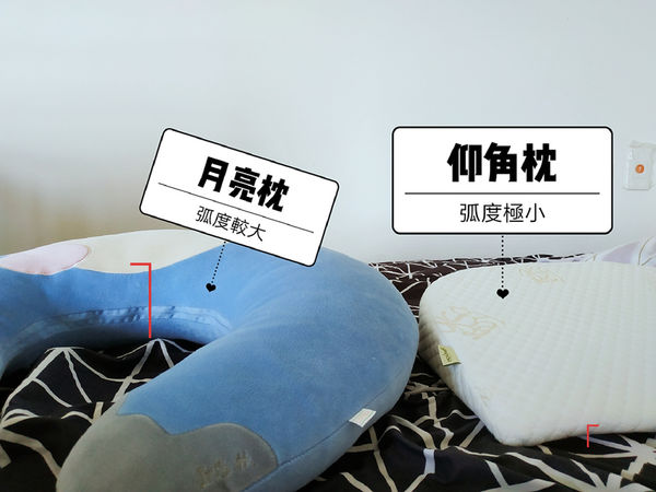 有了仰角枕之後,月亮枕就默默的被冷落在一邊,為什麼?其實擺再一起看就會發現月亮枕包覆感好但是離床面比較高,
