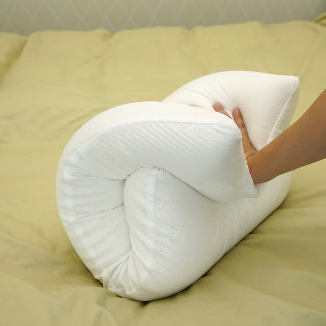 格蕾莎熟眠記形枕的枕芯是水感泡棉與科技乳膠製成的,所以柔軟度極佳,可以輕易對折或捲曲再回復原狀,而且又有支撐度,所以枕在上面睡覺,脖子感覺特別輕鬆。