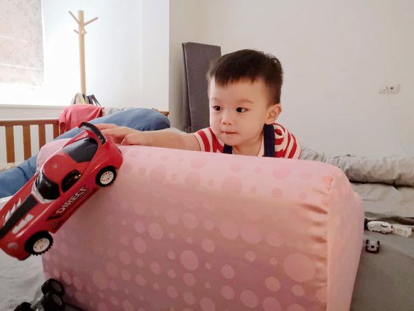 拿著車車把抬腿墊當作溜滑梯來使用,沒想到可以讓寶貝玩個半小時,玩到最後累了就直接坐上去…,