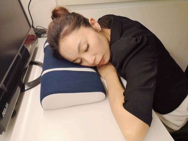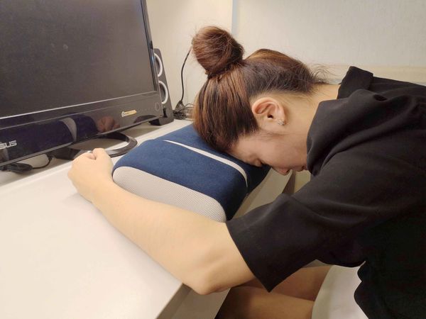 Ms珊小姐最喜歡趴睡,如圖中有了午睡枕,趴睡完全不會壓到雙手,因枕頭材質非常親膚,躺下去幾乎都可秒睡,若趴久了想換姿勢,這時額頭朝下的睡姿也是ok唷~