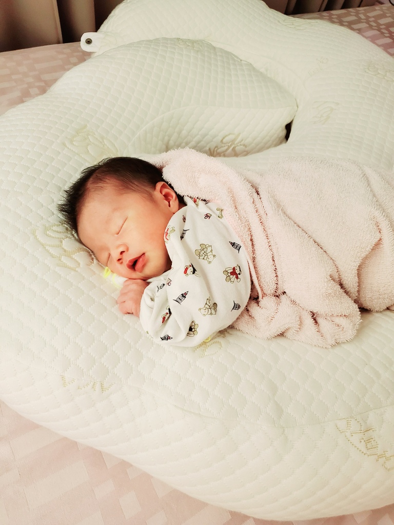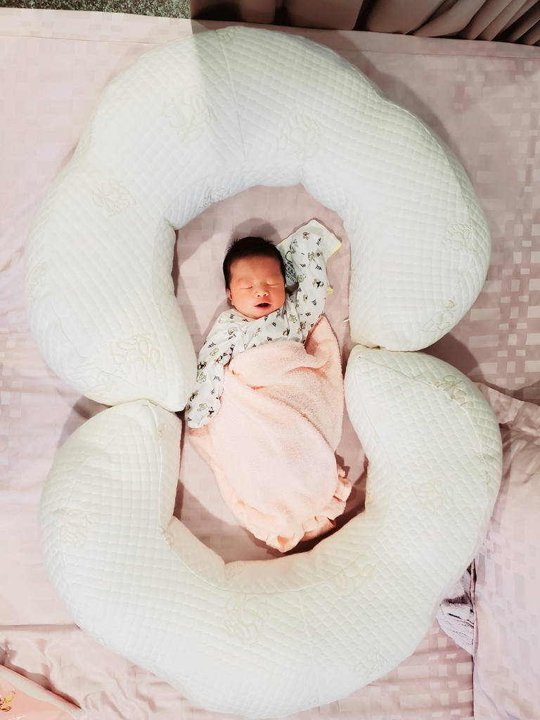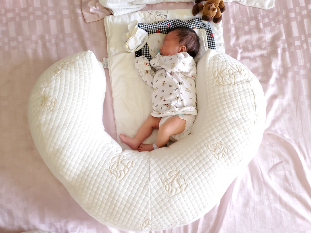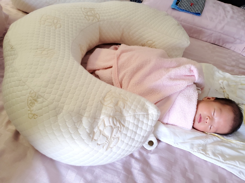親餵完有時候我會把兩個枕頭的C開口靠在一起,讓寶寶可以稍微在哺乳枕上側躺,寶寶會在上面睡得很熟,看起來舒服的我都想這樣躺了(但抱枕可能需要四倍大)