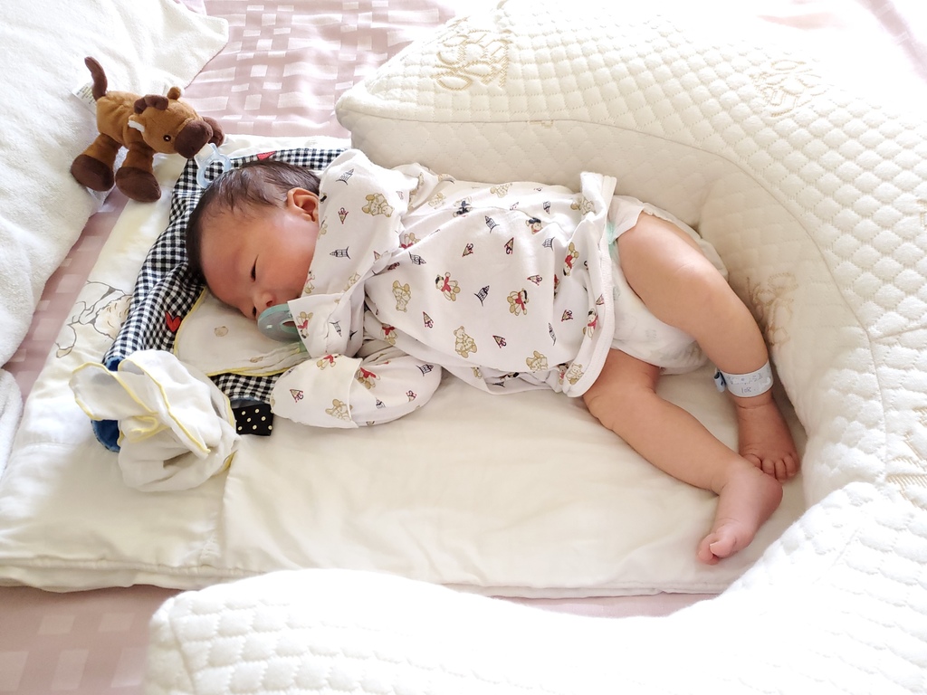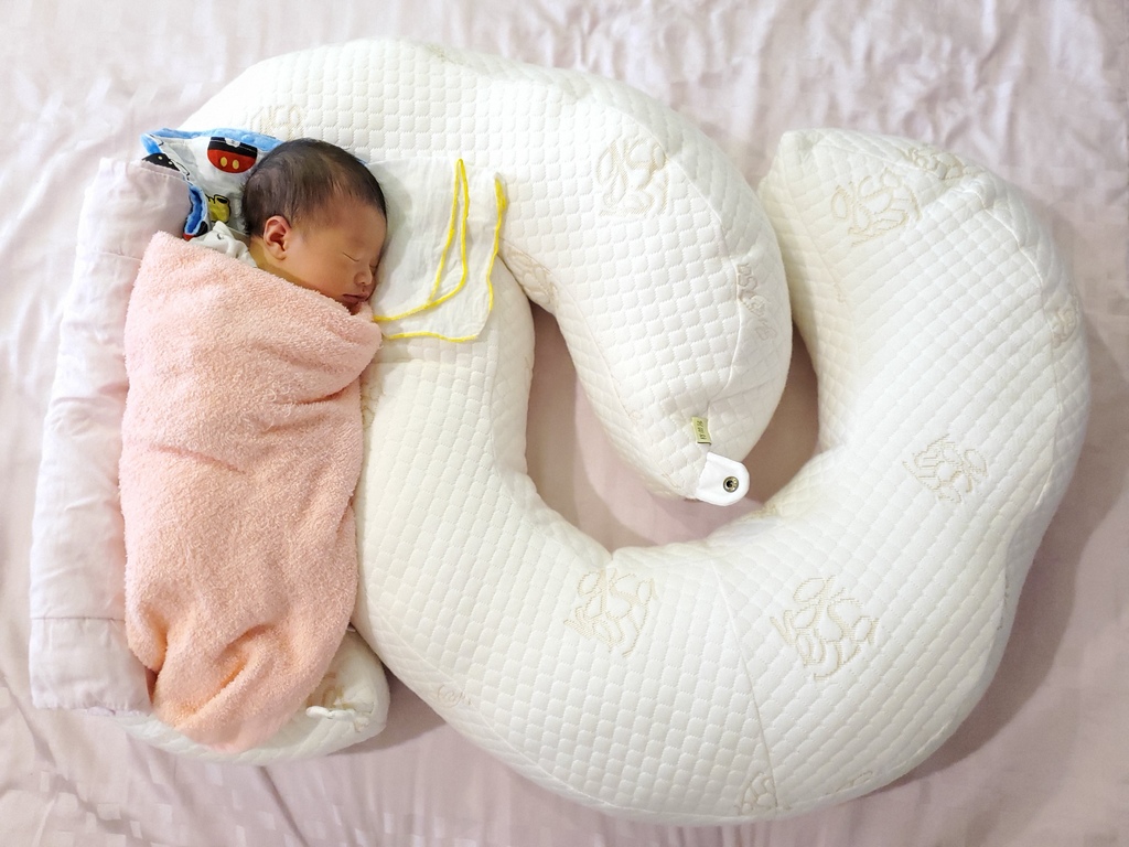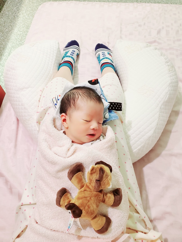 若親餵完寶寶還清醒著,我會用哺乳枕靠在他的背上,讓他側躺,比較不容易溢奶,包巾打開他也能稍微動一動手腳,晚上比較好睡!(我也可以睡比較久)