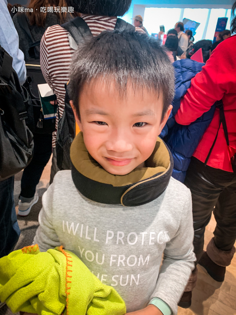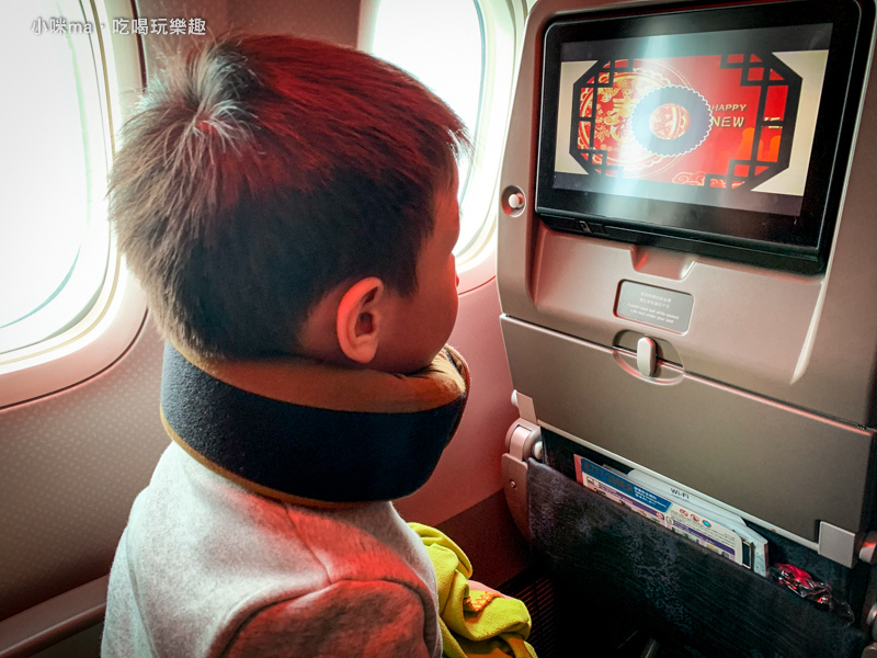 米寶的高度還無法靠到飛機椅的頭墊部分,用了GreySa格蕾莎 全家福旅行頸枕就能幫忙支撐懸空的部分