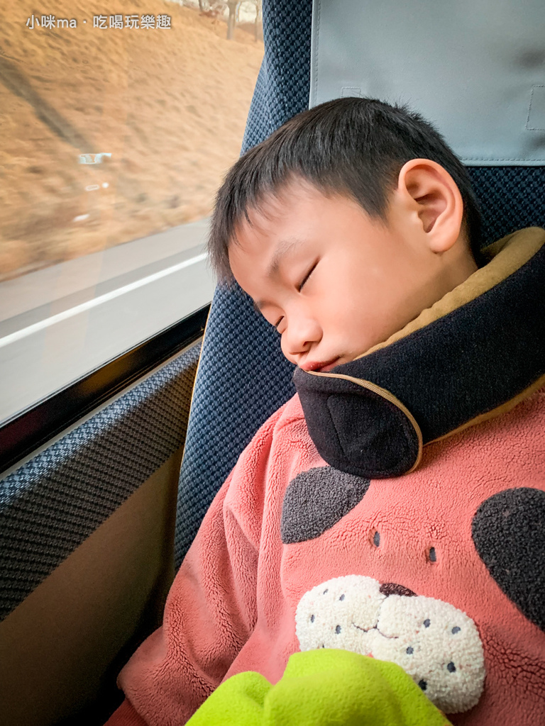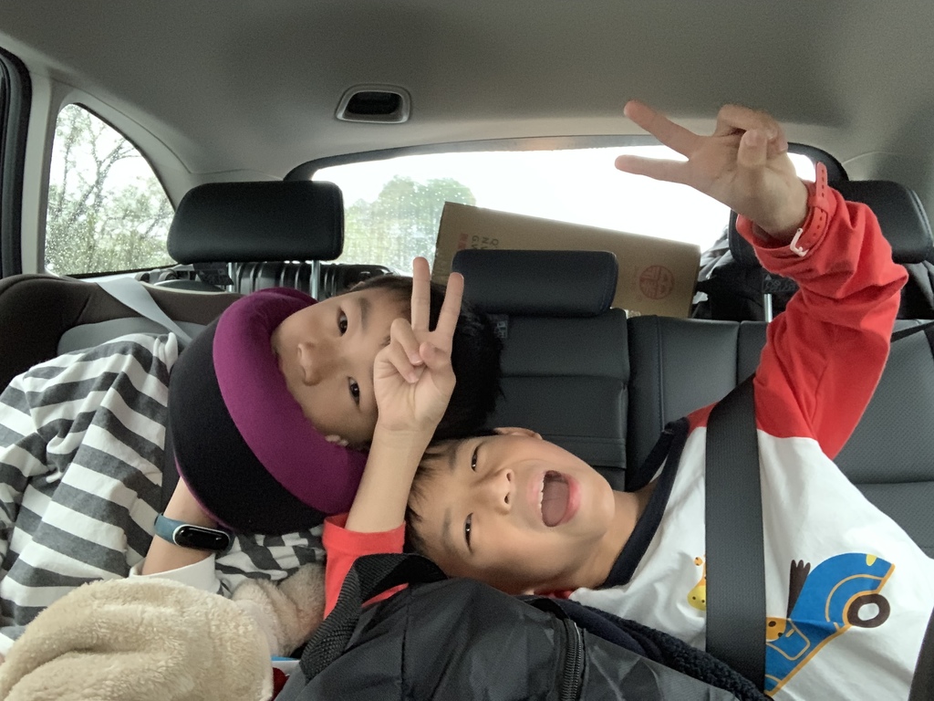 這趟旅程下來坐前面的孩子都睡得歪七扭八,小波跟米寶可睡得香甜了,完全沒撞到窗戶~哈哈哈