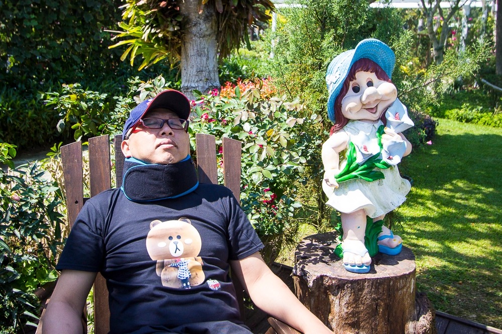 他說沒事的話可以補眠,果然可樂娜去兒童沙坑玩沙他馬上戴起頸枕老僧入定,