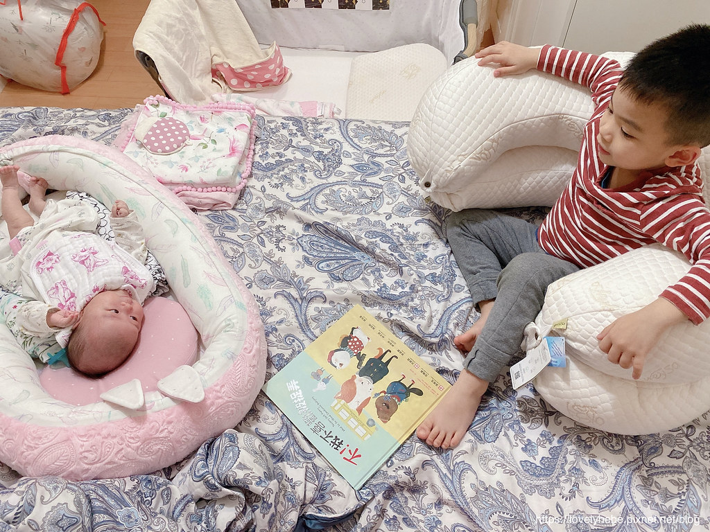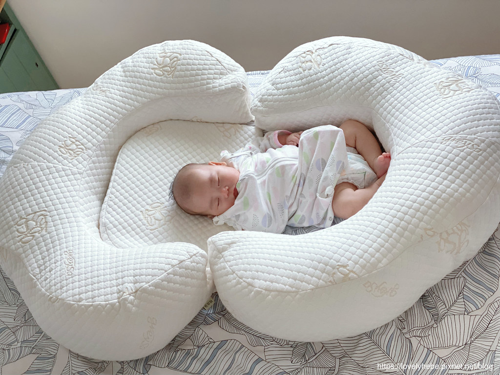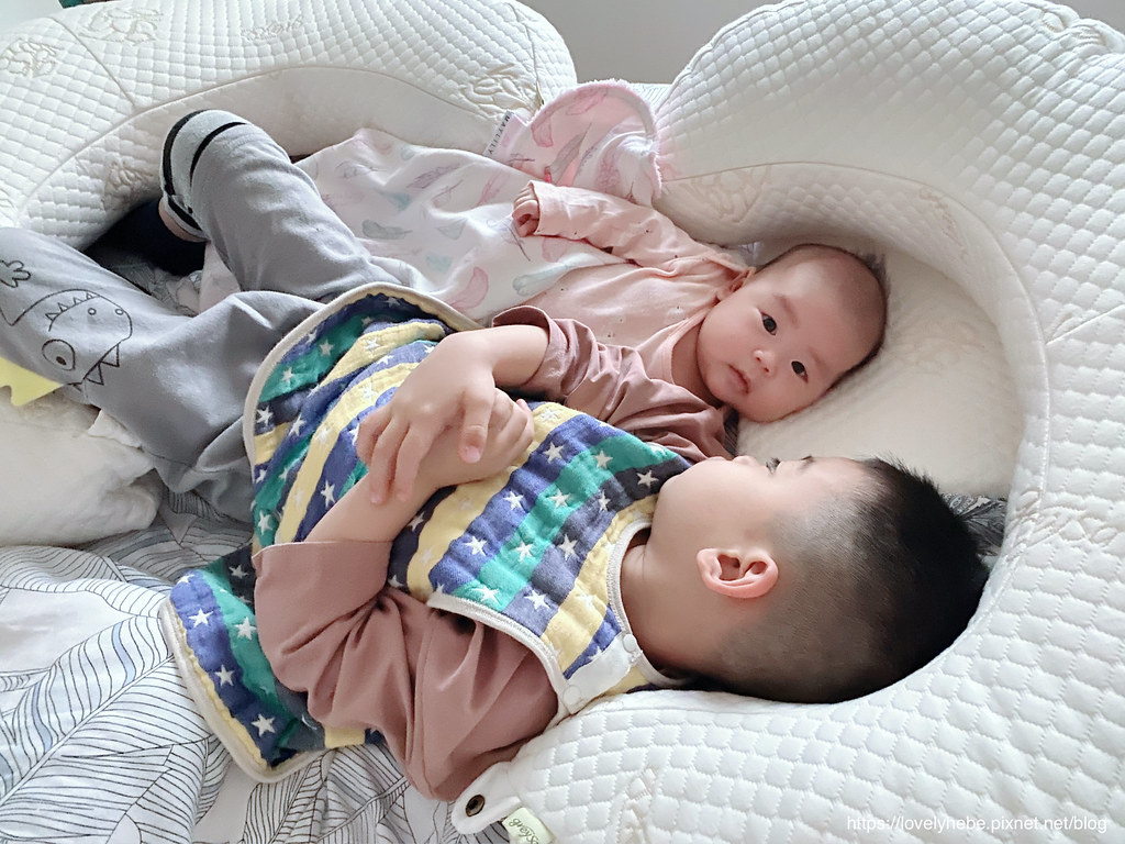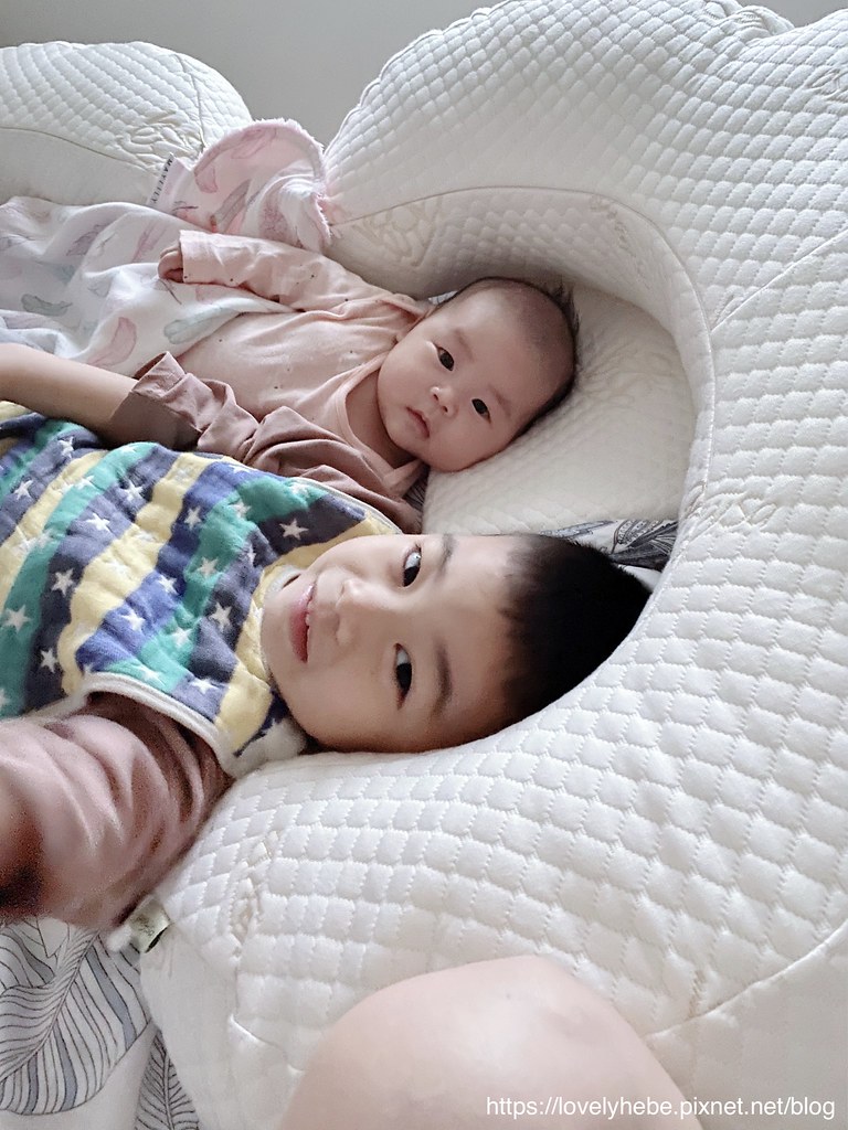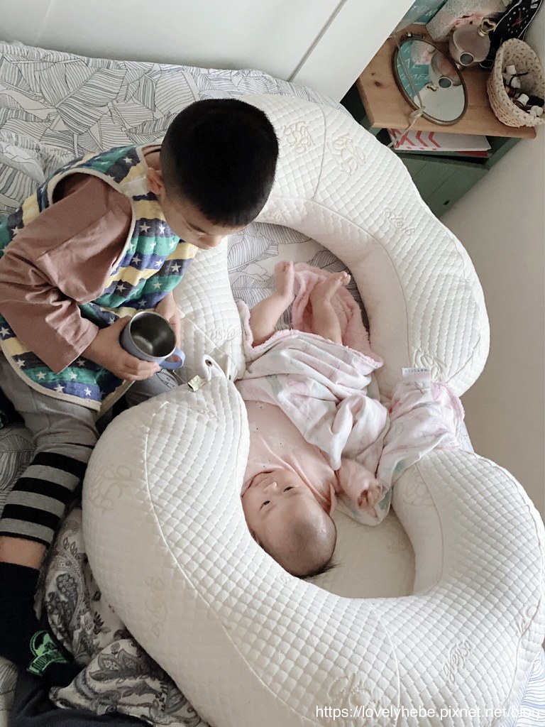 看到餵完奶後的妹妹躺在哺乳護嬰枕裡面
