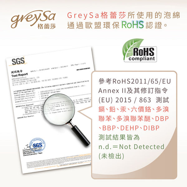 GreySa格蕾莎所使用的泡綿通過歐盟環保RoHS認證和歐盟REACH法規151項檢測