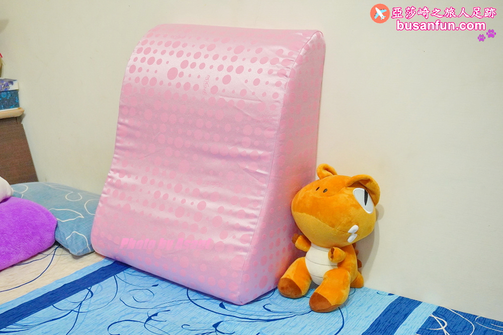 ^^亞莎崎的這個粉紅圓點抬腳枕,都是放在床上的,不抬腳的時候,會靠牆放直,既不佔空間,隨時想用就能使用。