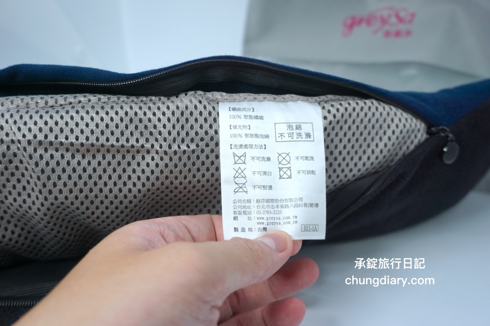 頸枕裡面的泡綿,是採用德國國際大廠原料的記憶泡綿。承錠提醒大家,頸枕裡面的泡綿是不可洗滌的喔!