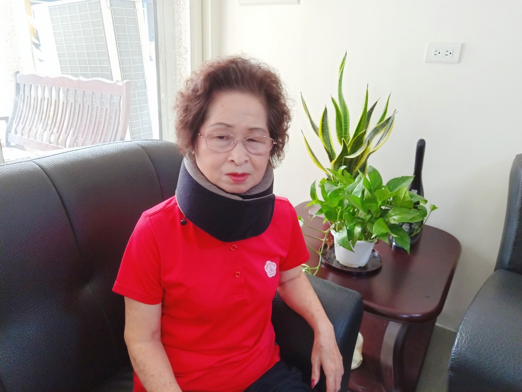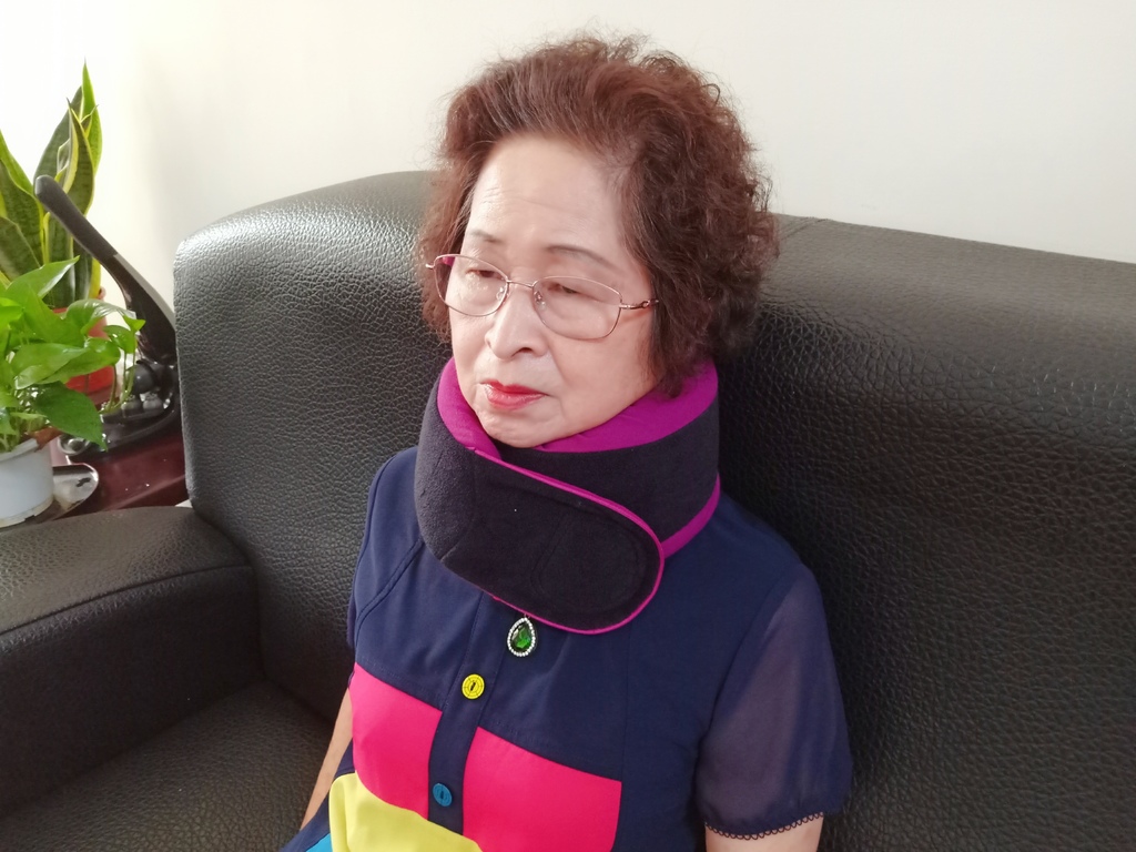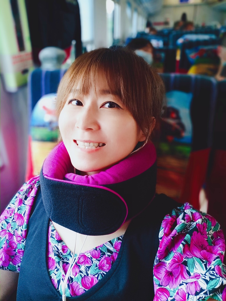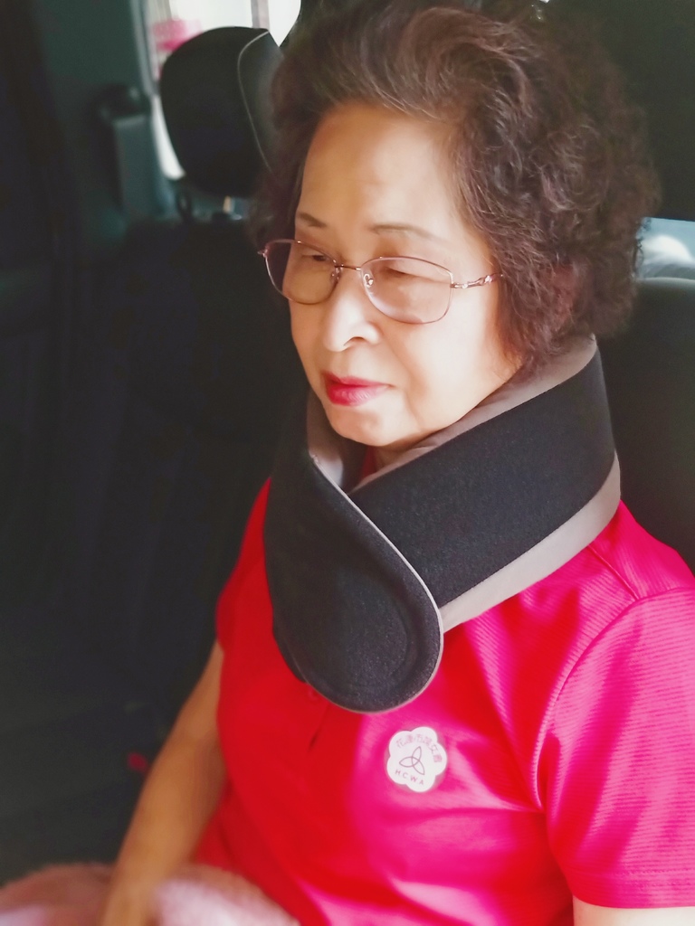 媽媽配戴著新購入的GreySa格蕾莎全家福旅行頸枕之後