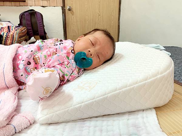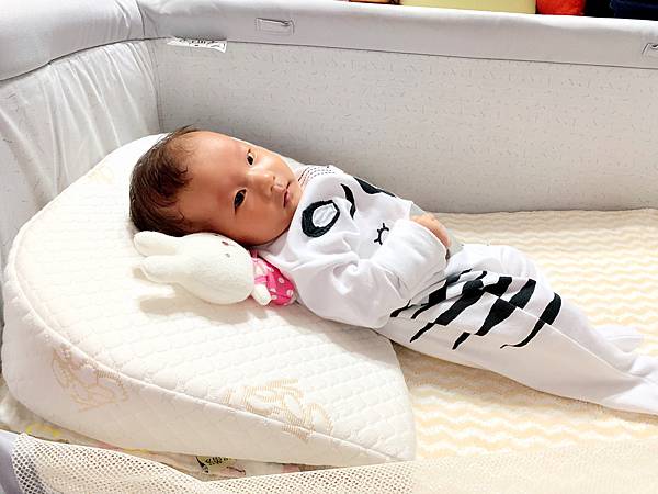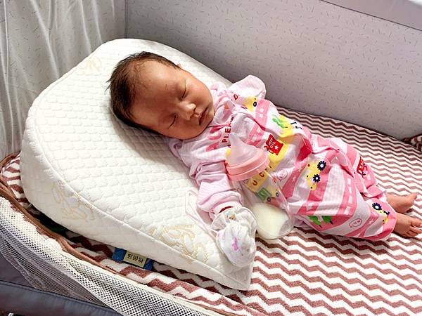 有時候我會讓寶寶在嬰兒床翻身側躺,用仰角枕固定住一邊
