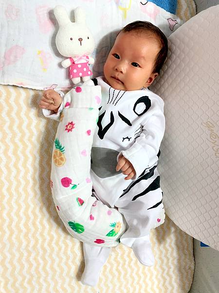 這個時候是快二個月,開始比較會抬頭、聽聲音,小眼睛也會跟著移動物轉啊轉的