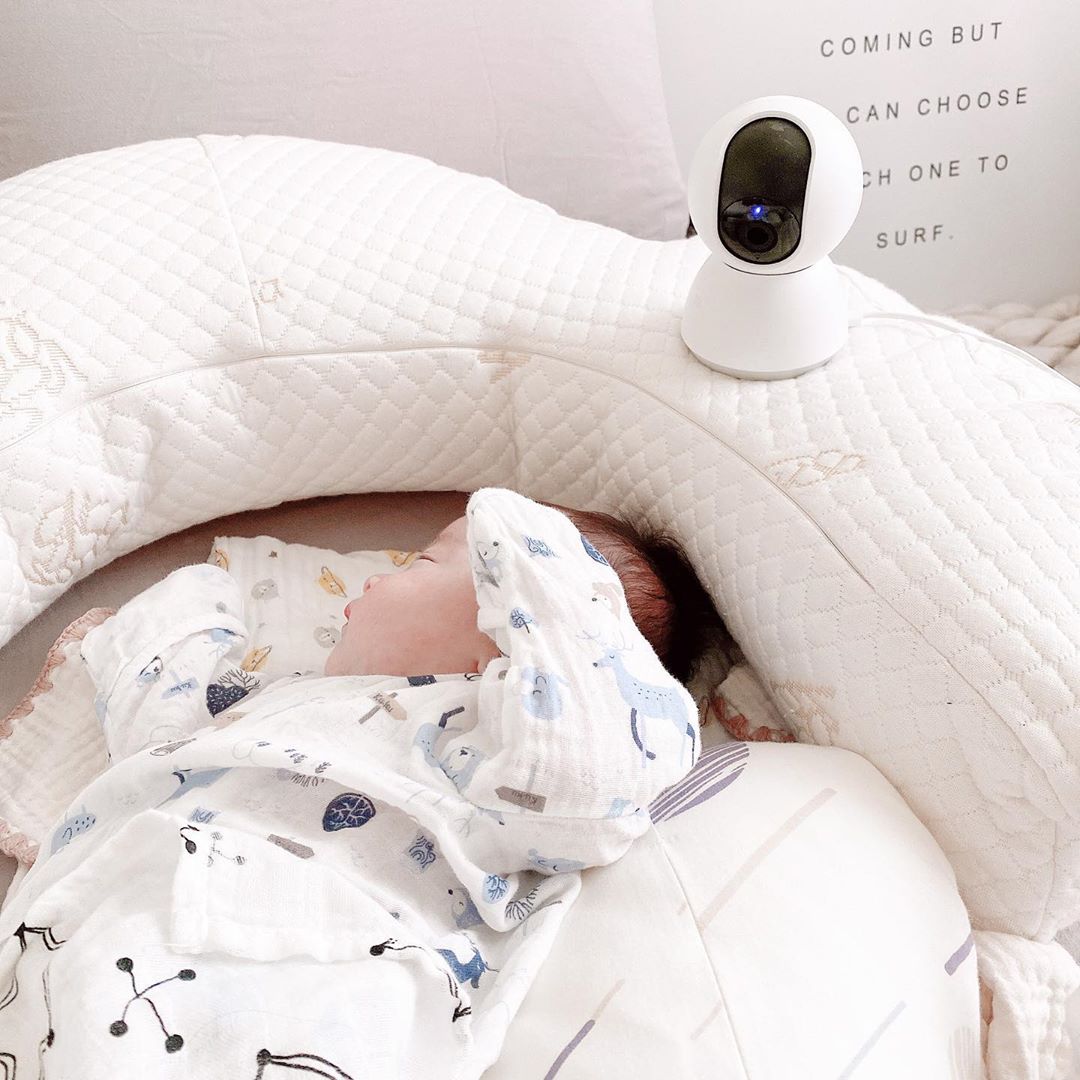 我們家小米菓快兩個月寶寶現在開始會扭來扭去了,把他放在裡面也不怕她滾下床枕頭周邊我發現還可以放一台小米攝影機隨時觀看寶寶下樓一下可以用監視器監視,這角度不錯喔!整個幫他當置物架~奶嘴、紗布巾一律可以放在旁邊隨時需要都可以使用,半夜吵鬧餵奶都可以信手拈來~不錯吧!