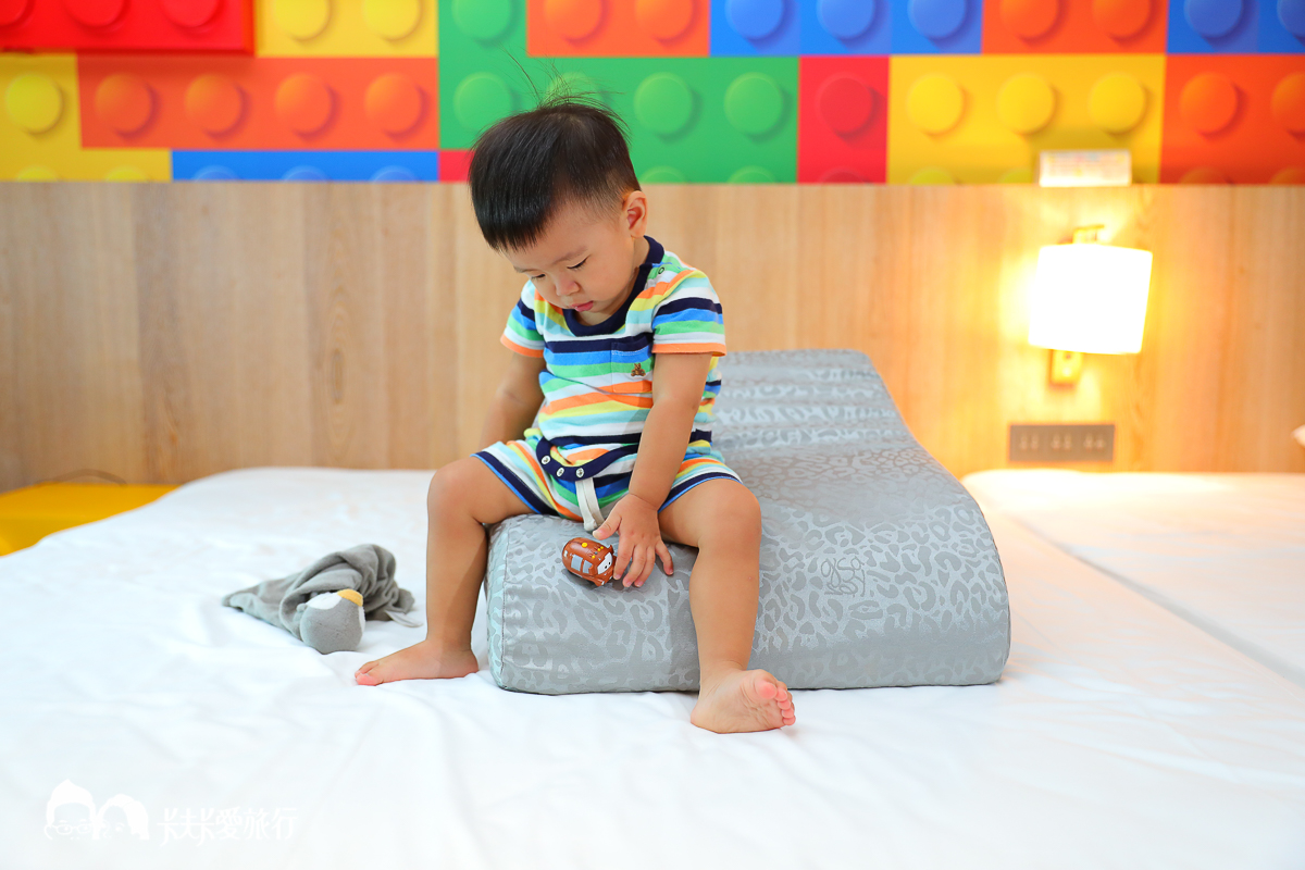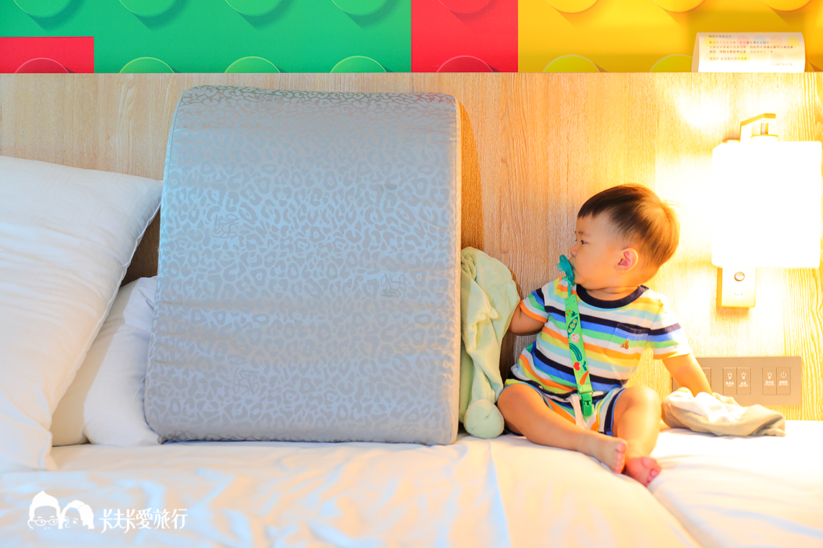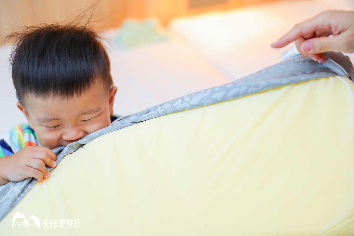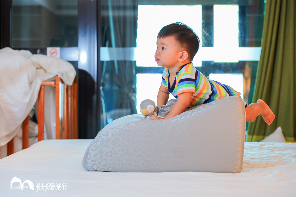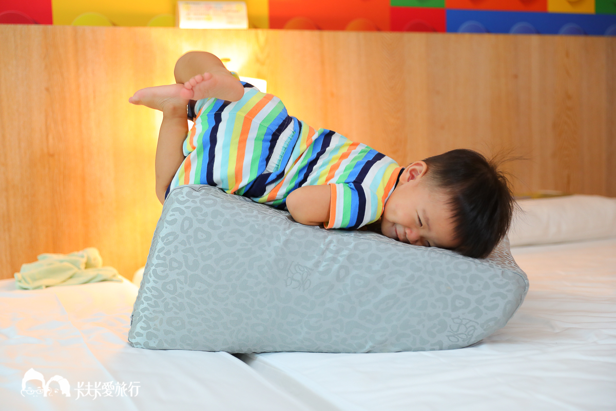 因為床比較高,宥宥無法自己上下(平常會自己上下沙發),這時候抬腿枕就變成他的小樓梯,就可以上下床,減少他的哭鬧或是直接跌落的危險