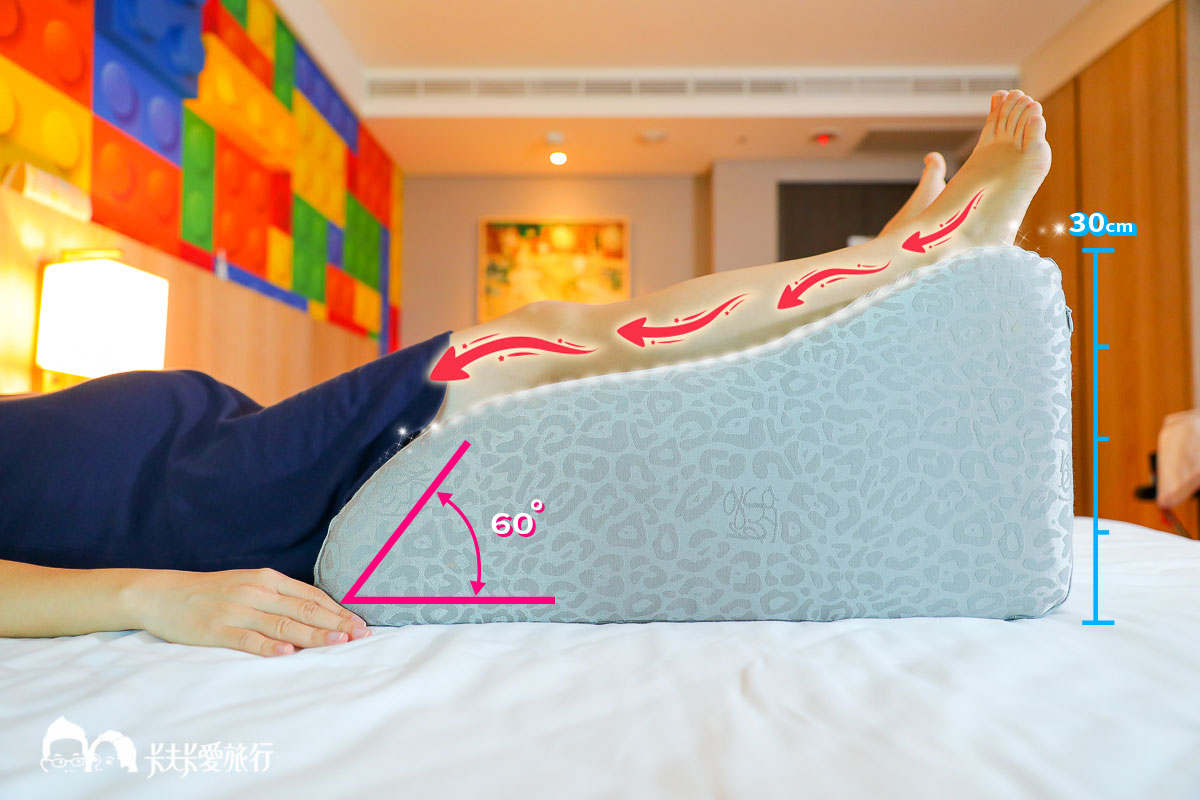 記得身體平躺後將後腳踝凹處置於抬腿枕最高峰,這樣才有剛好符合弧度喔
