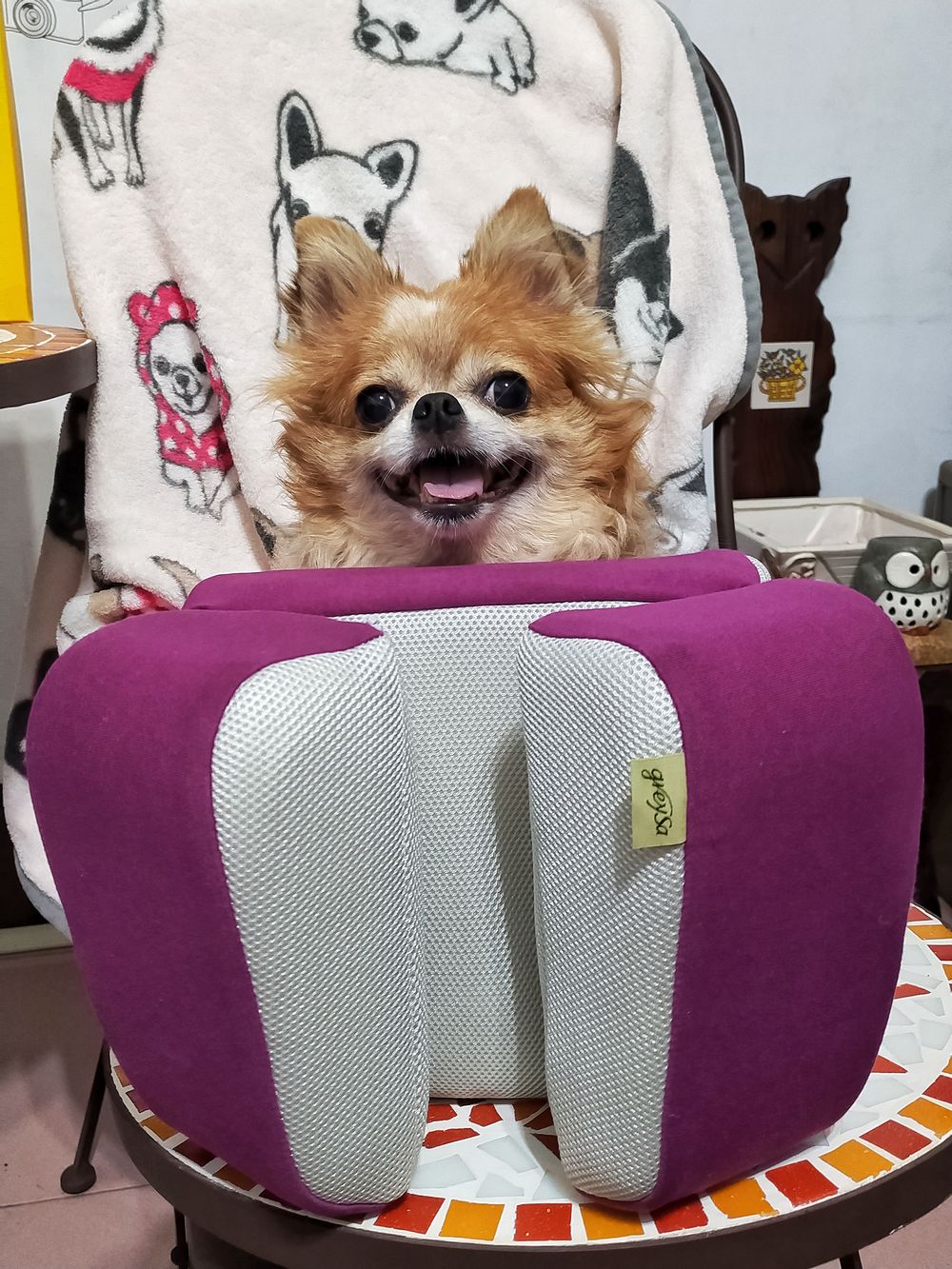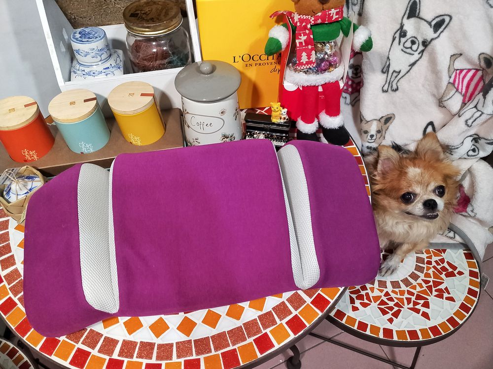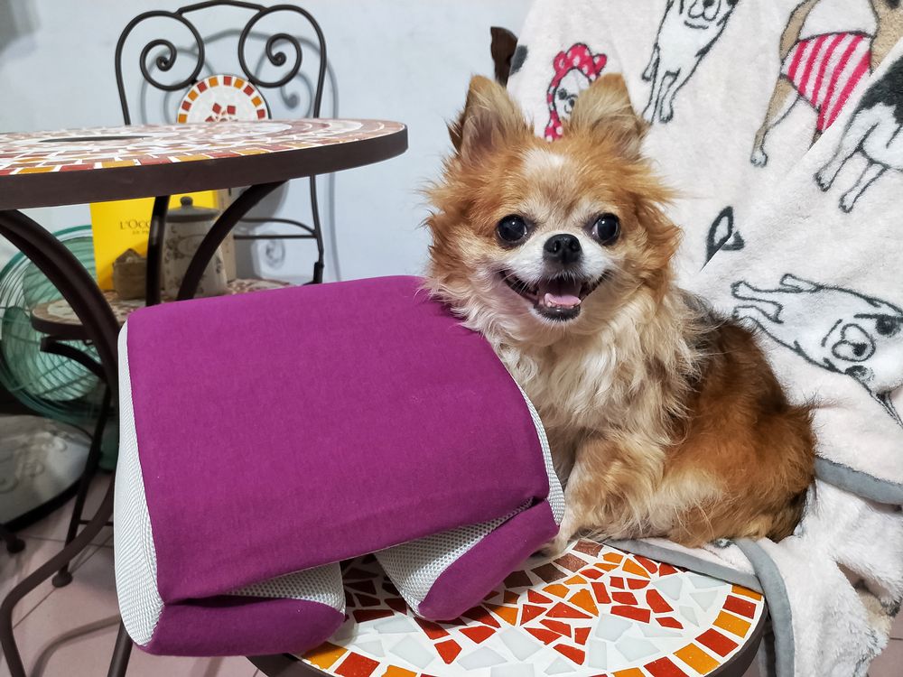 比貓咪還小的長毛吉娃娃歐寶貝,雖然有4公斤,但許多阿姨姊姊看到寶貝本尊時都會說:「歐寶貝看起來比照片上小隻很多耶……」是啊~宇宙無敵超級可愛!以小公主歐寶貝為比例尺,可見GreySa格蕾莎折疊式午睡枕也很輕巧!瞧我的一指神功~一根手指就把午睡枕頂起來囉!
