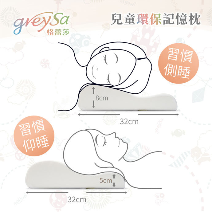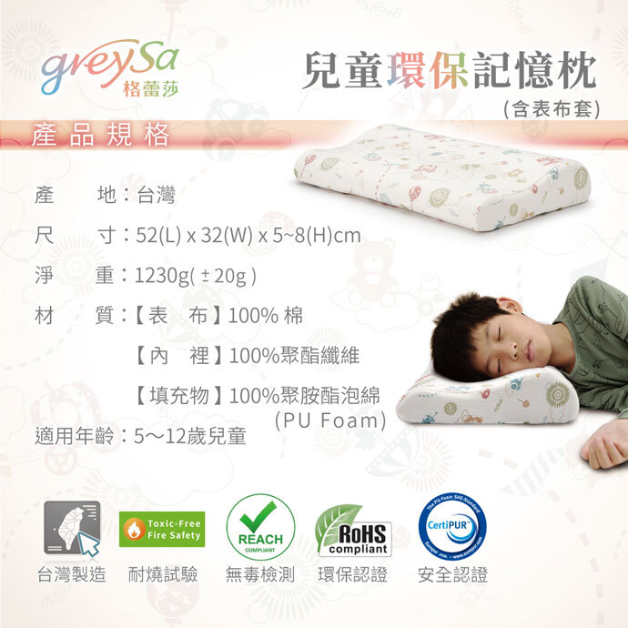 GreySa格蕾莎兒童環保記憶枕由台灣製造,通過無毒檢測,以及環保安全雙認證,適合5~12歲的兒童,這個年齡同時也是孩子發育的黃金時期,擁有良好的睡眠品質跟睡眠習慣,才能使寶貝健康的成長和茁壯。GreySa格蕾莎兒童側睡抱枕