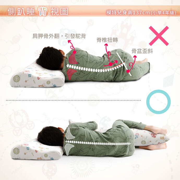以前我並不知道,原來小孩側趴睡的時候,會因為肩膀及手臂無支撐,導致胸口壓迫,連帶造成駝背;如果腿部無支撐,身體長時間扭轉的話,睡姿不良更可能導致脊椎側彎及骨盆歪斜,長期下來將嚴重影響兒童的發育。