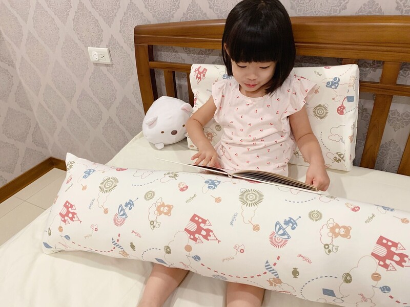 看到女兒那麼滿意這次體驗的GreySa格蕾莎兒童環保記憶枕&兒童側睡抱枕,自己也很開心。每晚睡前是我們的親子共讀時間,她會先自己閱讀繪本,再由我唸給她聽。於是,就把記憶枕立起來給她當靠墊,然後將側睡抱枕放在她腳上,使書本可以立起來,這樣也是一種很棒的用途呢!