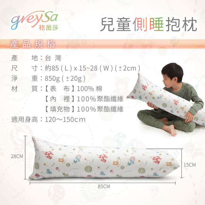 GreySa格蕾莎兒童側睡抱枕也是台灣製造,填充物為100%聚酯纖維,適合身高120~150cm的兒童。雖然我女兒現在才105cm,側睡抱枕對她來說有點大,但是隨著年齡增加,相信抱起來會越來越順手。而我自己是153cm的嬌小女性,同樣很適合來使用這款側睡抱枕。