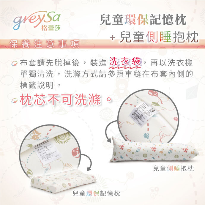 特別提醒大家,使用GreySa格蕾莎兒童環保記憶枕&兒童側睡抱枕之前,一定要先把布套脫下來清洗乾淨,而且務必裝進「洗衣袋」裡面,再以洗衣機單獨清洗(溫和洗滌、不可乾洗、不可漂白、不可烘乾、墊布熨燙)。另外,還要記得「枕芯」是不可洗滌的!