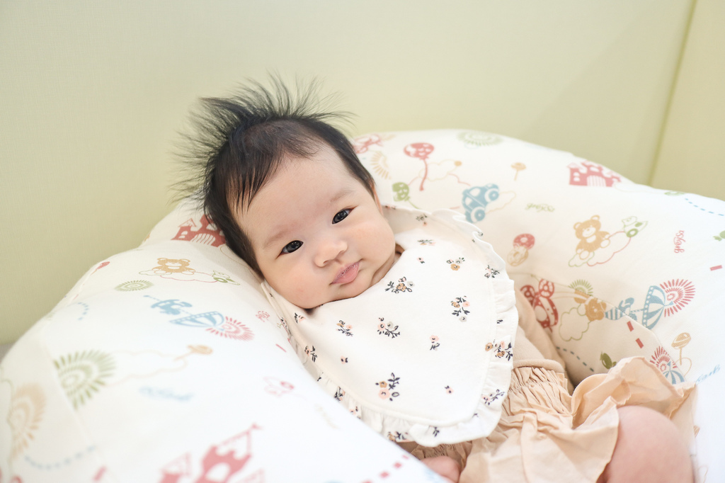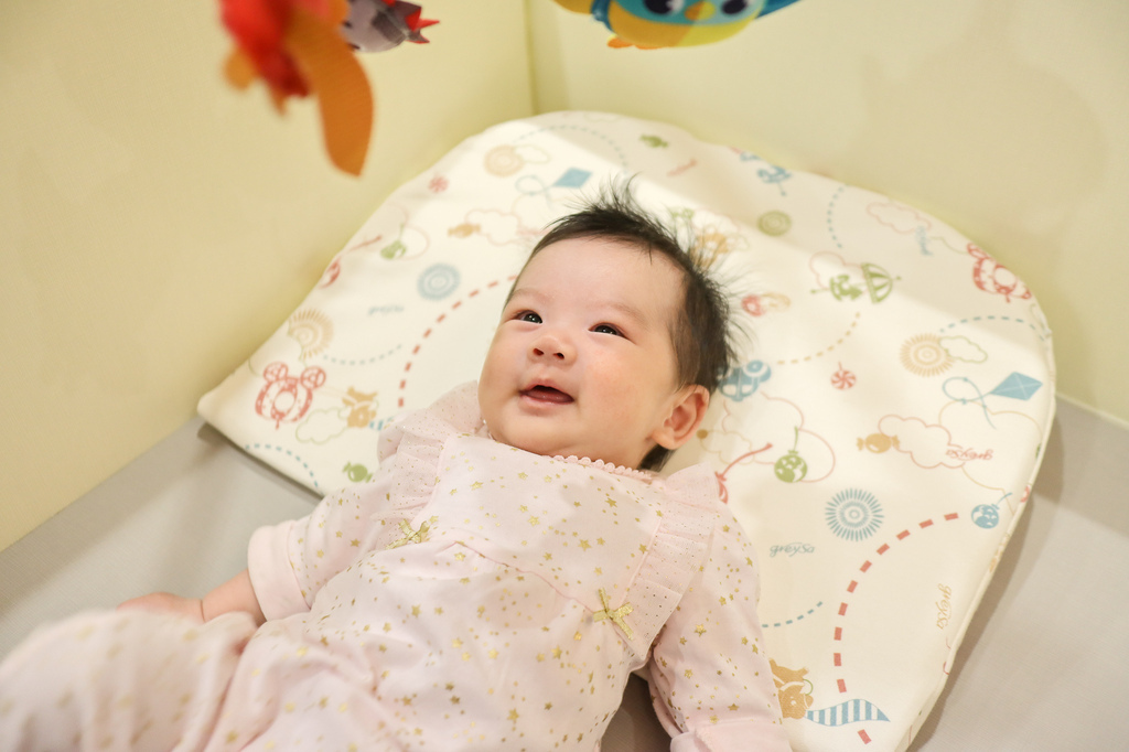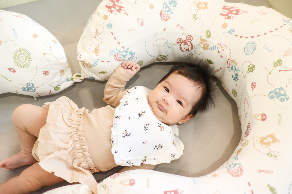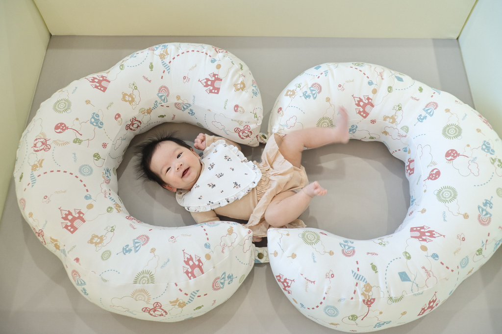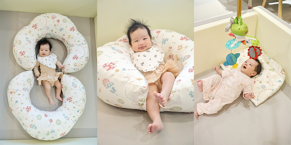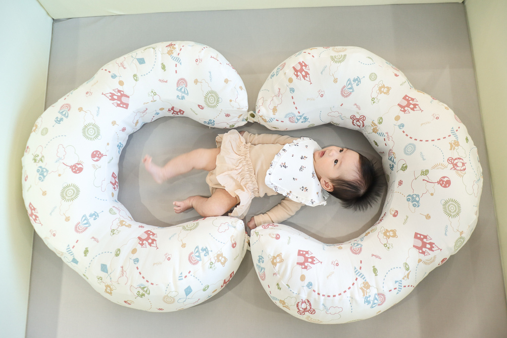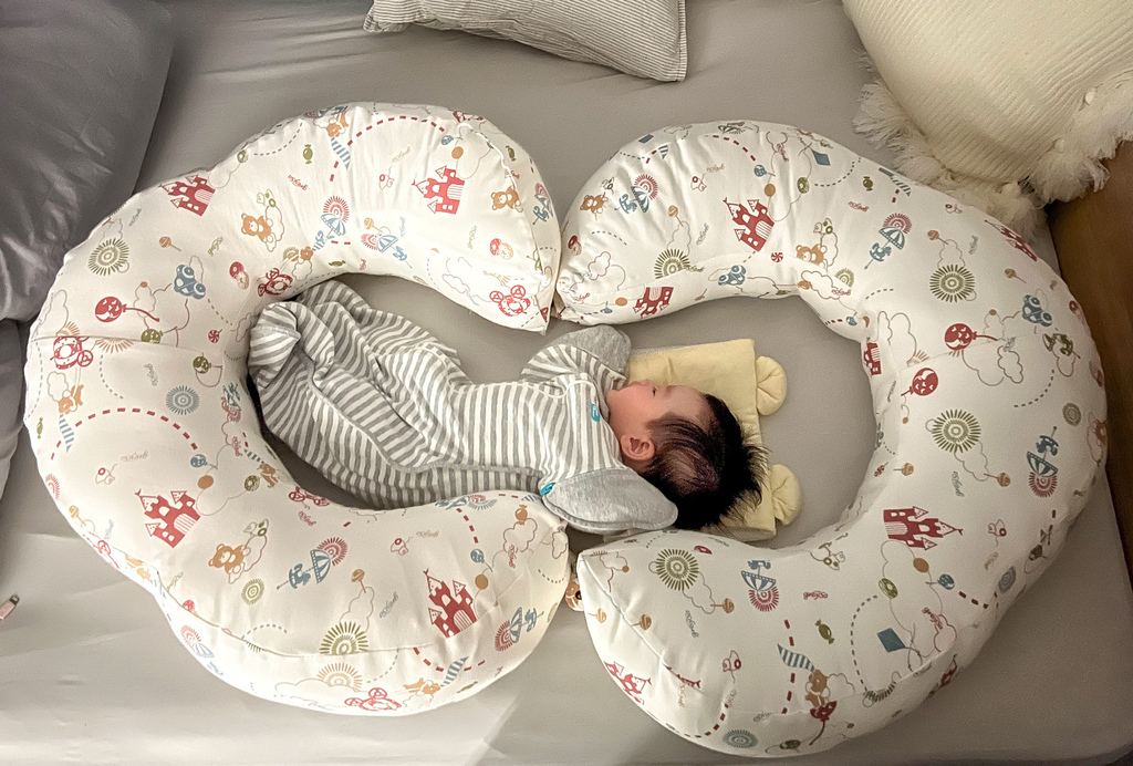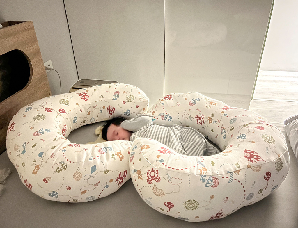 所以放在大床時我會使用哺乳護嬰枕把她圍起來避免她踢腿移動位置