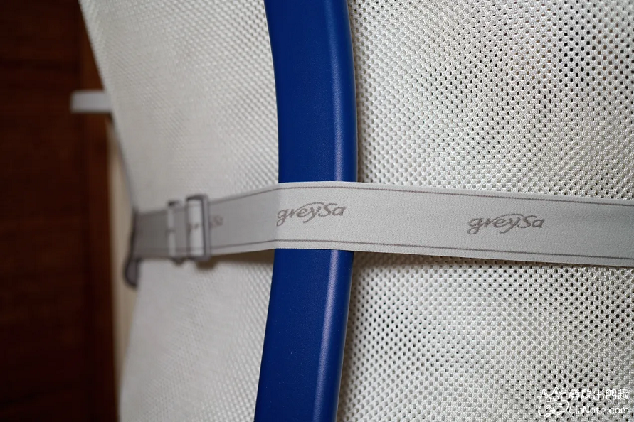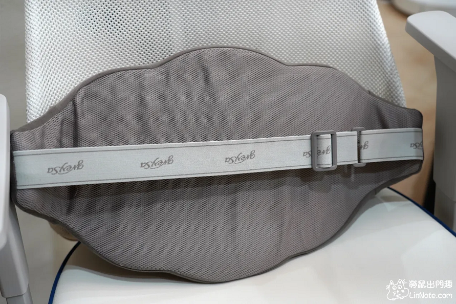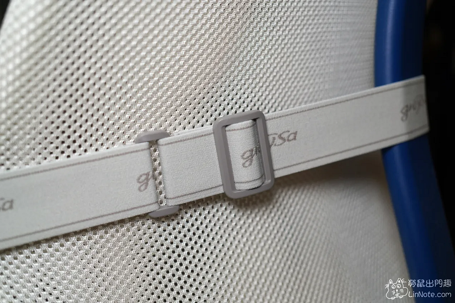 跟大部分的靠枕產品一樣,背面用伸縮帶固定靠枕的位置,不過許多靠枕沒辦法調整長度,格蕾莎的靠枕是可調式的,可以依據不同的椅寬去調整他的伸縮帶長度。