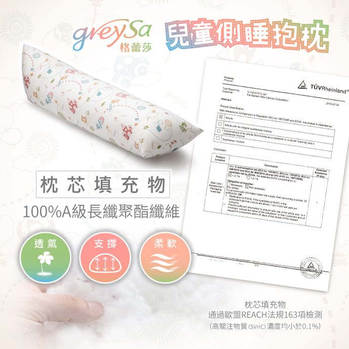 GreySa格蕾莎兒童側睡抱枕的枕芯填充物採用100% A級長纖聚酯纖維