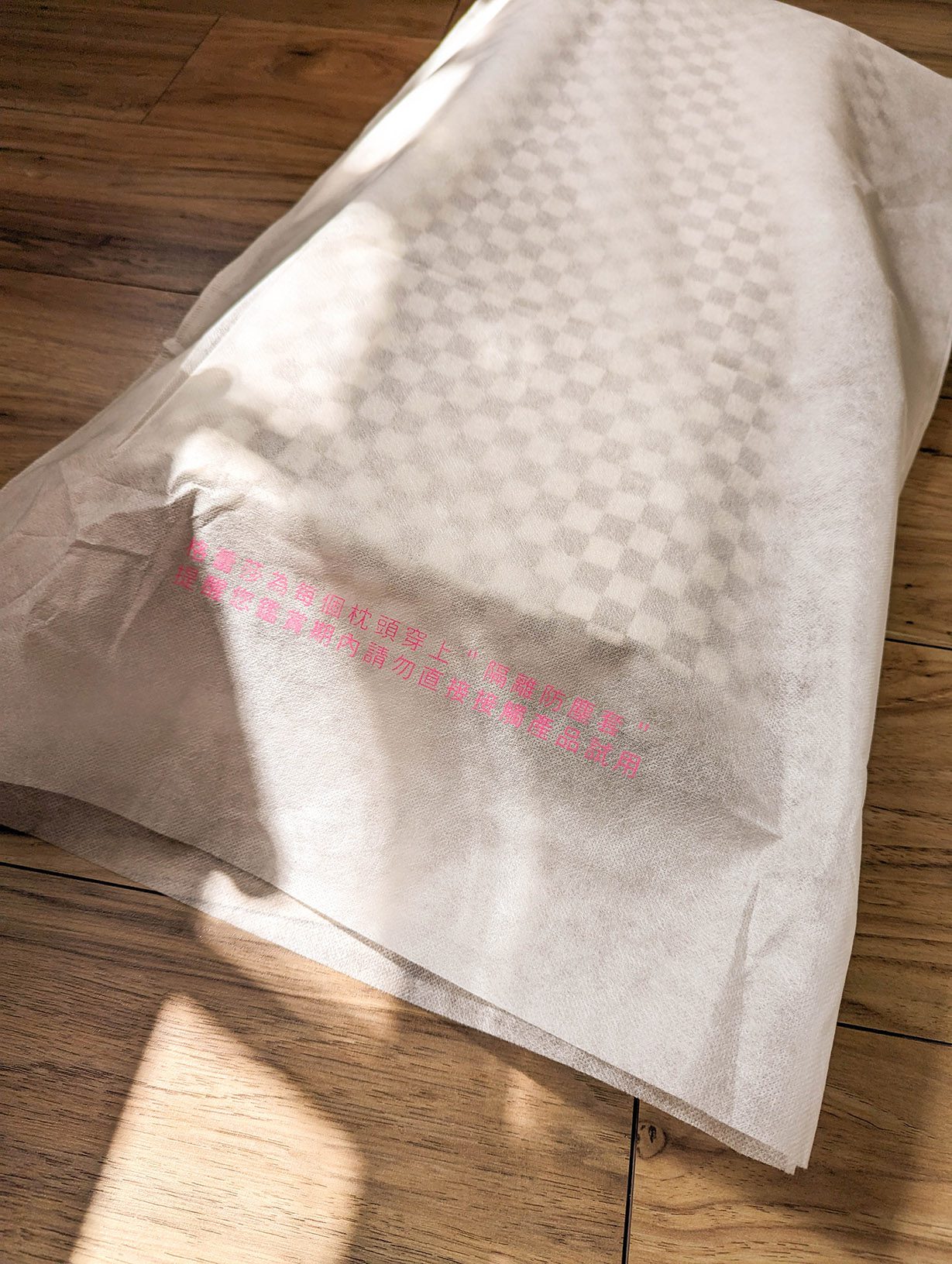 拆開外盒後可以看到枕頭被包裝的很好,還有套一個塑膠袋避免髒污,外面還貼著貼心的提醒喔!開箱的這天是晚上,誠哥很急著就要拿去用了。所以以下的圖片都是這段實際體驗的時間累積下來的照片囉!