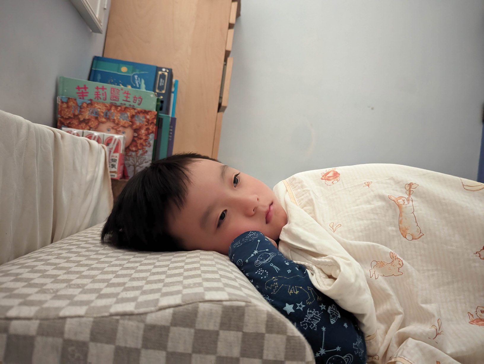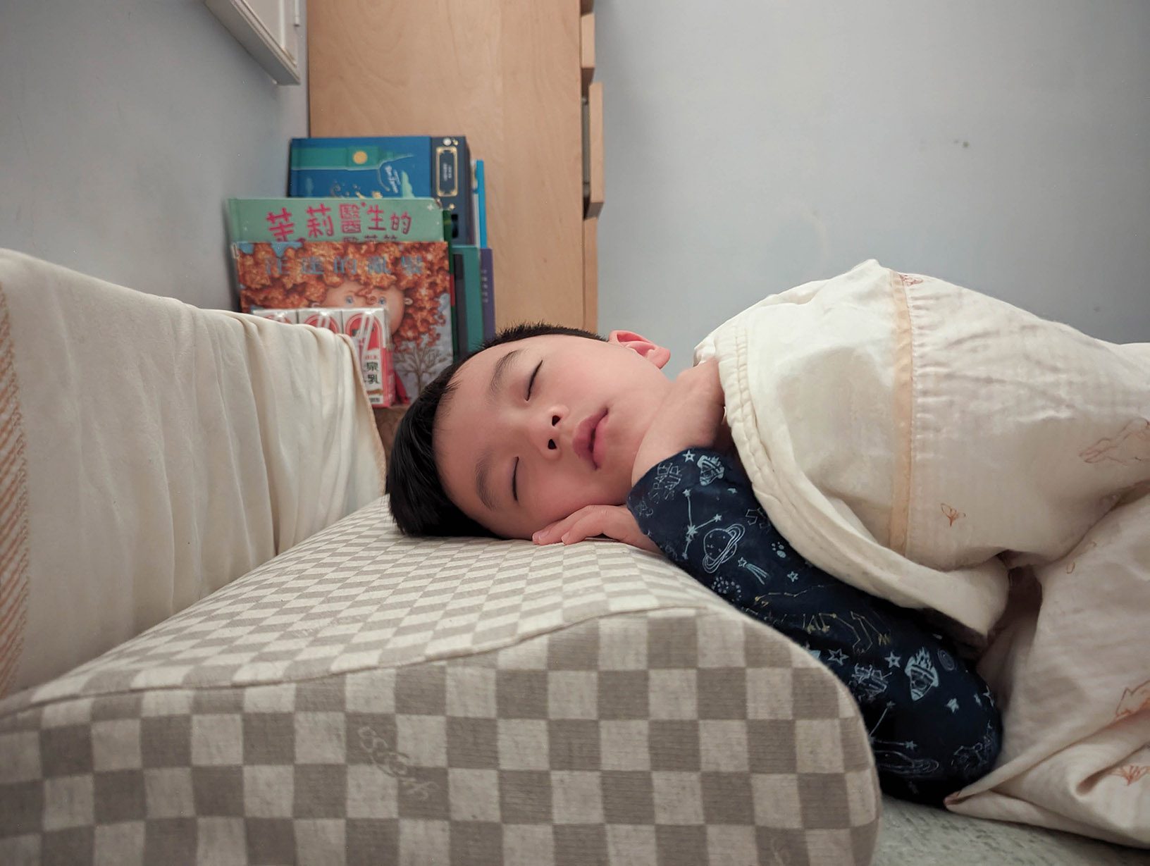 其實拍照的時候誠哥都已經睡了快一個月了。為了拍下最自然的樣子,我都早上起來偷拍他(笑)。誠哥平常喜歡側睡,所以幫他轉到高的這邊讓他睡。