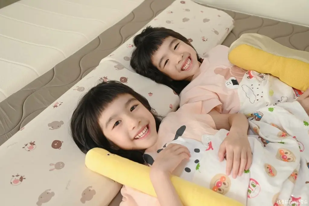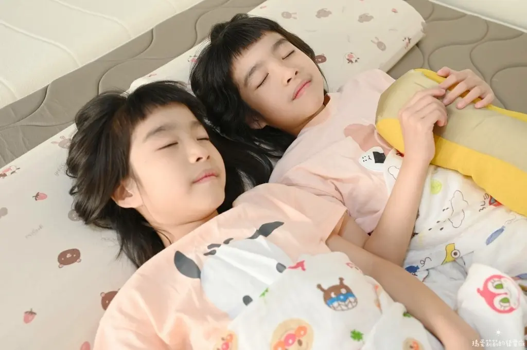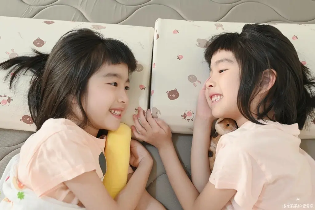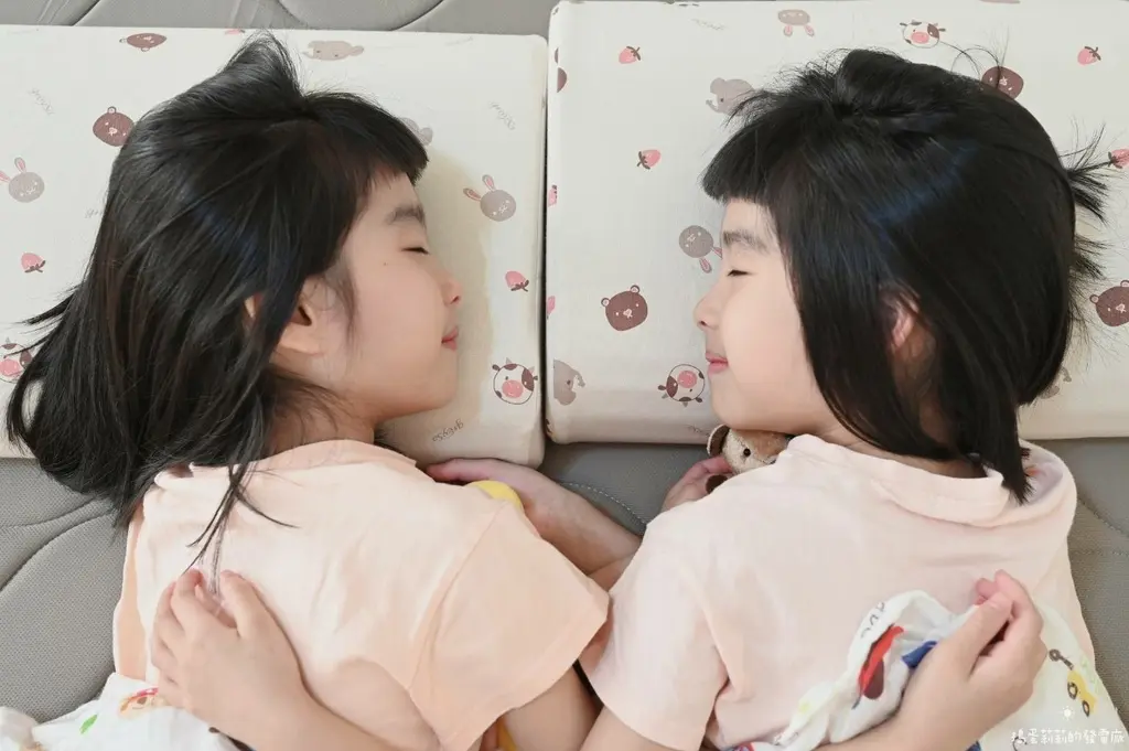 之前她們會跟大人一起躺枕頭,但其實對她們來說太高,半夜會頻繁翻身