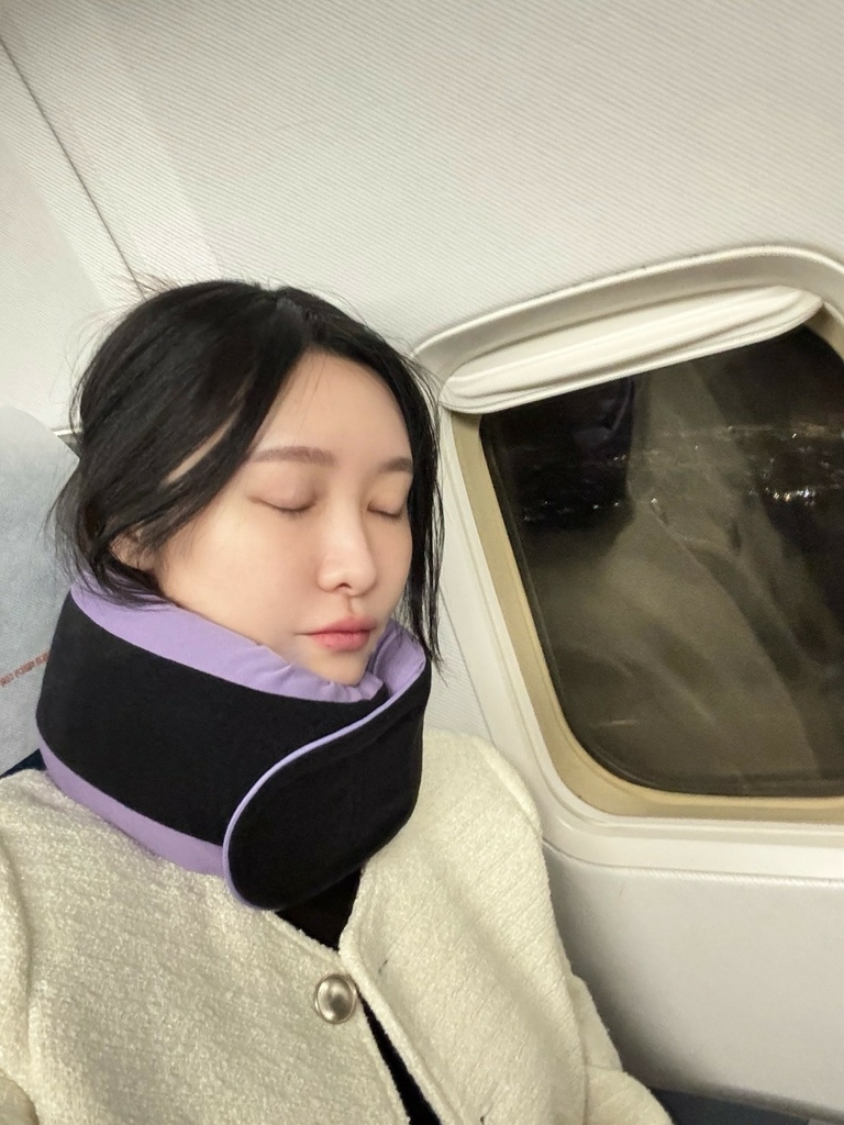坐在飛機上戴著 GreySa 格蕾莎全家福旅行頸枕