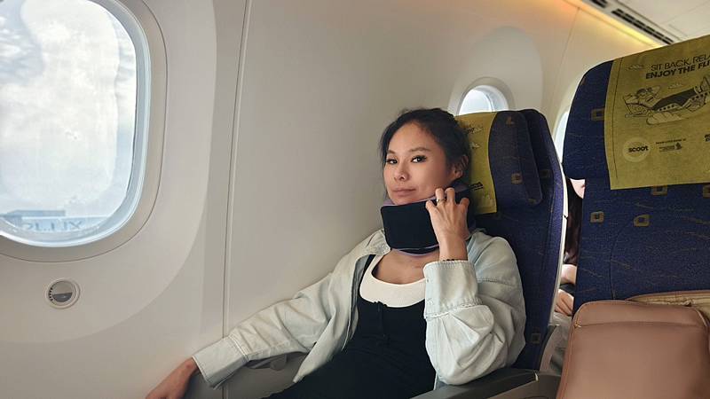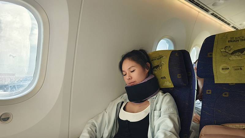 這趟旅程的班機時間凌晨就要抵達機場,候機時也沒辦法好好休息,上了飛機補眠,幸好有格蕾莎全家福頸枕